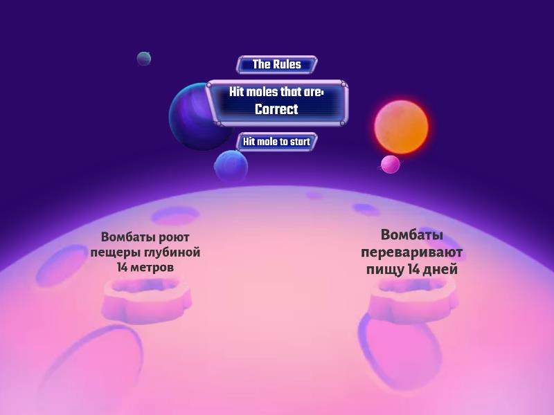 Correct: Вомбаты роют пещеры глубиной 14 метров, В природе встречаются касатки с фиолетовой окраской, Порода собак чау-чау выведена в США, Обезьян никогда не отправляли в космос, Волнистые попугают имеют только 2 варианта окраски, Морской выдрой называют один из видов акул, Сайгаки обитают в лесах, Дальневосточных аистов сейчас больше 30 тысяч особей, Белый медведь — третий по величине хищник планеты, Incorrect: Вомбаты переваривают пищу 14 дней, Детёныши касаток могут не спать несколько недель, У чау-чау язык синего цвета, Самцы некоторых видов обезьян могут лысеть, Обезьяны различают себя в зеркале, Некоторые виды попугаев могут есть глину, Зубр могут весить до 700 кг, Размеры тела каланов могут достигать 1.5 метров!, Синий кит — самое большое животное на планете,