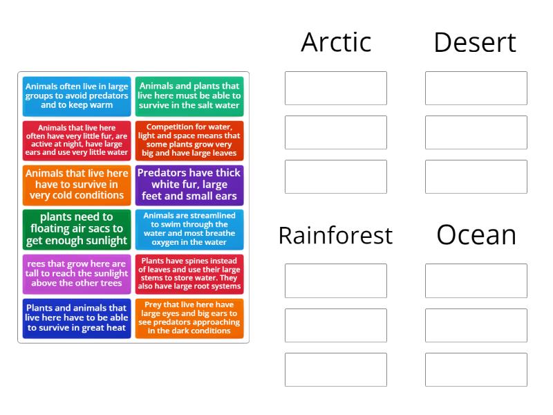 Arctic: Animals that live here have to survive in very cold conditions, Animals often live in large groups to avoid predators and to keep warm, Predators have thick white fur, large feet and small ears , Desert: Plants and animals that live here have to be able to survive in great heat , Animals that live here often have very little fur, are active at night, have large ears and use very little water, Plants have spines instead of leaves and use their large stems to store water. They also have large root systems, Rainforest: rees that grow here are tall to reach the sunlight above the other trees, Prey that live here have large eyes and big ears to see predators approaching in the dark conditions, Competition for water, light and space means that some plants grow very big and have large leaves, Ocean: Animals and plants that live here must be able to survive in the salt water, plants need to floating air sacs to get enough sunlight, Animals are streamlined to swim through the water and most breathe oxygen in the water,