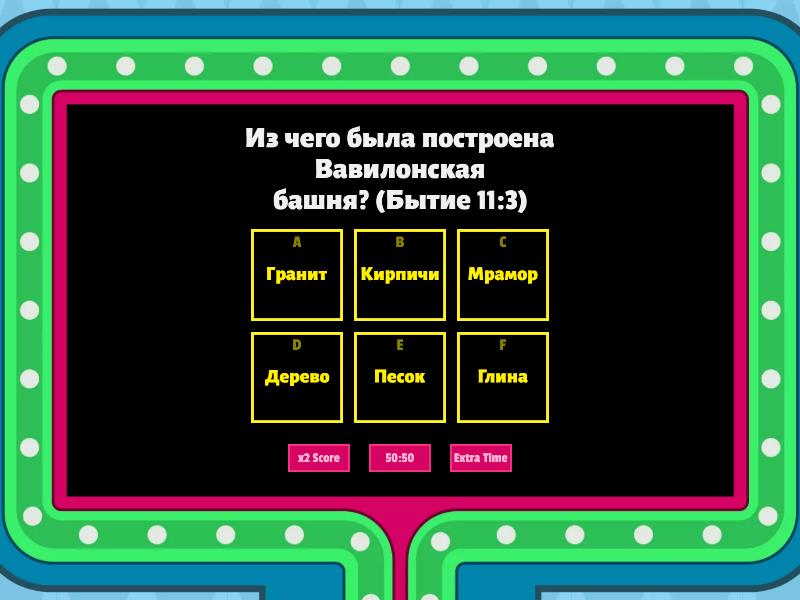 1) Из чего была построена Вавилонская башня? (Бытие 11:3) a) Гранит b) Кирпичи c) Мрамор d) Дерево e) Песок f) Глина 2) Какой материал необходимо было израильтянам добавлять в глину для изготовления кирпичей? (Исход 5:7) a) Песок b) Опилки c) Солома d) Цемент e) Песок f) Известняк 3) На чем была сделана надпись в царском дворце? (Даниила 5:5) a) На дощечке b) На пергаменте c) На камне d) На скрижалях e) На штукатурке f) На стекле 4) Какой металл заготовил Давид для строительства храма, что его невозможно было взвесить? (1Летопись 22:3) a) Аллюминий b) Бронза c) Латунь d) Железо e) Медь f) Серебро 5) Какой материал в основном применялся для постройки дома Давида? (2 Самуила 5:11) a) Глина b) Кирпичи c) Шлакоблок d) Пеноблок e) Гранит f) Кедр 6) Из какого материала были изготовлены трубы, чтобы собрать народ и снять лагерь? (Числа 10:2) a) Серебро b) Дерево c) Латунь d) Пластик e) Карболит f) Бронза 7) Из какого материала изготовляли посуду для отдельных случаев? (Римлянам 19:1) a) Хрусталь b) Мрамор c) Глина d) Пластик e) Фарфор f) Малохит 8) Из какого материала была часть истукана, которая символизировала Римскую империю? (Даниила 2:40) a) Железо b) Медь c) Серебро d) Глина e) Платина f) Золото 9) Из какого редкого металла были изготовлены гвозди для храма? (2 Летопись 3:9) a) Железо b) Дерево c) Серебро d) Латунь e) Бронза f) Золото 10) Чем был покрыт ковчег внутри и снаружи? (Бытие 6:14) a) Штукатурка b) Смола c) Пластик d) Черепица e) Глина f) Асфальт