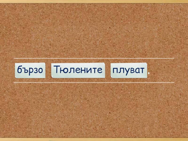 Тюлените плуват бързо., Любка се люлее на люлката., Юни и юли са летни месеци., Люлякът храст ли е?, Любомир има нов костюм., Излюпиха ли се пуйчетата?, Защо  щъркелите отлитат на юг?,