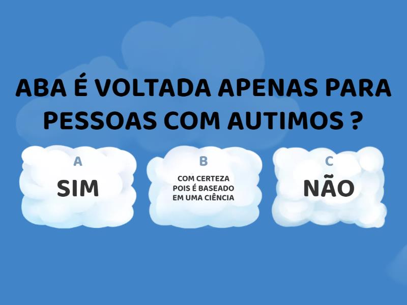 1) ABA É VOLTADA APENAS PARA PESSOAS COM AUTIMOS ? a) SIM b) COM CERTEZA POIS É BASEADO EM UMA CIÊNCIA c) NÃO 2) É NECESSÁRIO VARIAR O REFORÇO REFORÇO SOCIAL ? a) NÃO É NECESSÁRIO b) SIM POIS O REFORÇO SOCIAL AUXILIA A CRIANÇA SE MANTER MOTIVADA c) A CRIANÇA NÃO PRECISA DE REFORÇO SOCIAL 3) AS SETES DIMESSÕES DA ANÁLISE DO COMPORTAMENTO SÃO: a) APLICADA; COMPORTAMENTAL; ANÁLITICO; TECNOLÓGICO; CONCEITUAL; EFICAZ; PARTICULARIZADO b) TECNOLÓGICO; CONCEITUAL; EFICAZ; PARTICULARIZADO; SINTÉTICO; COMPORTAMENTAL; APLICADA   c) APLICADA; COMPORTAMENTAL; ANÁLITICO; TECNOLOGIC; CONCEITUAL; EFICAZ; GENERALISTA  4) QUANDO A CRIANÇA APRESENTAR COMPORTAMNTO DE BIRRA O APLICADOR DEVE: a) REFORÇAR O COMPORTAMENTO DANDO ATENÇÃO b) IGNORAR O COMPORTAMENTO PARA NÃO SER REFORÇADO  c) FAZER CONTATO VISUAL ATÉ A CRIANÇA PARAR 5) ANÁLISE FUNCIONAL: É A FERRAMENTA QUE IRÁ IDENTIFICAR O QUE ESTÁ REFORÇANDO A PERMANÊNCIA DO COMPORTAMENTO E QUAL SUA FUNÇÃO? a) NÃO, ANÁLISE FUNCIONAL É QUANDO A CRIANÇA ESTÁ COM FOME b) É A BUSCAR IDENTIFICAR RELAÇÕES FUNCIONAIS ENTRE O COMPORTAMENTO E O AMBIENTE c) TEM COMO OBJETIVO REFORÇAR COMPORTAMENTOS INADEQUADOS