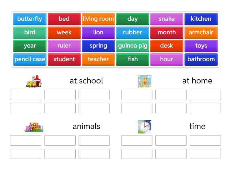 at school: ruler, teacher, student, desk, pencil case, rubber, at home: living room, bathroom, kitchen, toys, armchair, bed, animals: bird, lion, butterfly, snake, guinea pig, fish, time: hour, month, year, day, week, spring,