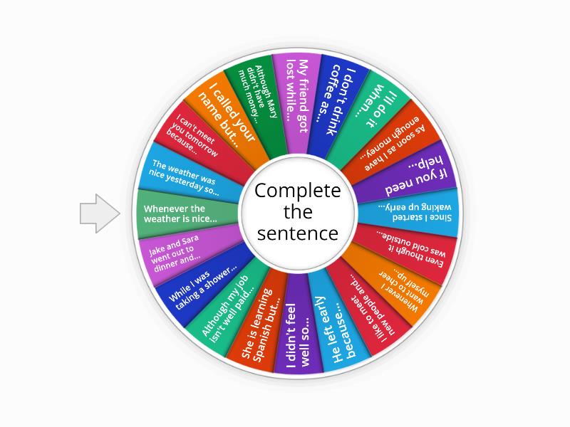 The weather was nice yesterday so..., I can't meet you tomorrow because..., I called your name but..., Although Mary didn't have much money..., My friend got lost while..., I don't drink coffee as..., I'll do it when..., As soon as I have enough money..., If you need help..., Since I started waking up early..., Even though it was cold outside..., Whenever I want to cheer myself up..., I like to meet new people and..., He left early because..., I didn't feel well so..., She is learning Spanish but..., Although my job isn't well paid..., While I was taking a shower..., Jake and Sara went out to dinner and..., Whenever the weather is nice....