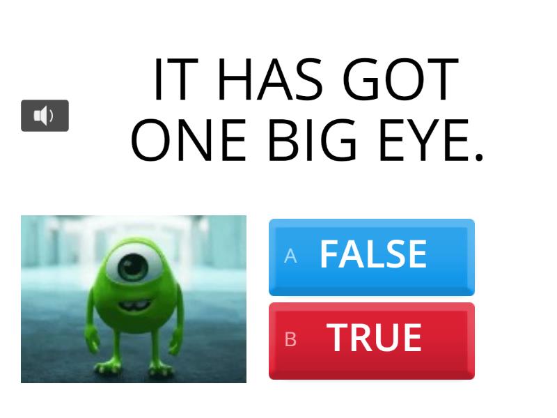 1) IT HAS GOT ONE BIG EYE. a) FALSE b) TRUE 2) IT HAS GOT FOUR EYES. a) TRUE b) FALSE 3) IT HAS GOT THREE EYES. a) TRUE b) FALSE 4) IT HAS GOT A SMALL MOUTH. a) TRUE b) FALSE 5) IT HAS GOT FIVE EARS. a) TRUE b) FALSE 6) IT HAS GOT SIX EYES. a) TRUE b) FALSE