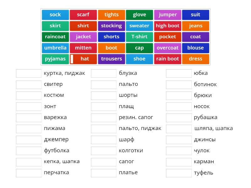hat - шляпа, шапка , cap - кепка, шапка , shoe - туфель, boot - ботинок , glove - перчатка , mitten - варежка, jeans - джинсы , sweater - свитер , trousers - брюки, jacket - куртка, пиджак , shirt - рубашка , T-shirt - футболка, skirt - юбка , shorts - шорты , coat - пальто, пиджак, blouse - блузка , sock - носок , umbrella - зонт, tights - колготки , pocket - карман , high boot - сапог, suit - костюм , raincoat - плащ , rain boot - резин. сапог, overcoat - пальто , scarf - шарф , stocking - чулок, pyjamas - пижама , dress - платье , jumper - джемпер,