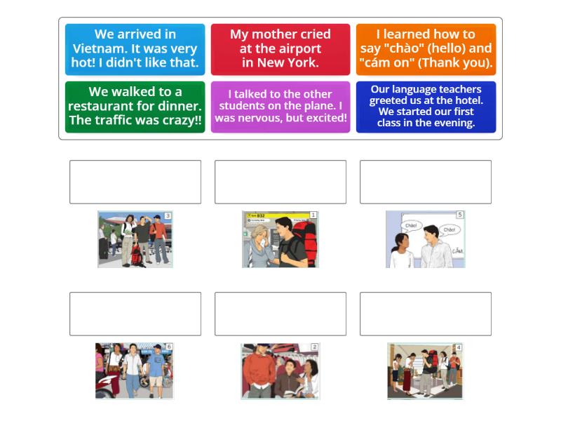 My mother cried at the airport in New York., I talked to the other students on the plane. I was nervous, but excited!, We arrived in Vietnam. It was very hot! I didn't like that., Our language teachers greeted us at the hotel. We started our first class in the evening., I learned how to say "chào" (hello) and "cám on" (Thank you)., We walked to a restaurant for dinner. The traffic was crazy!!,