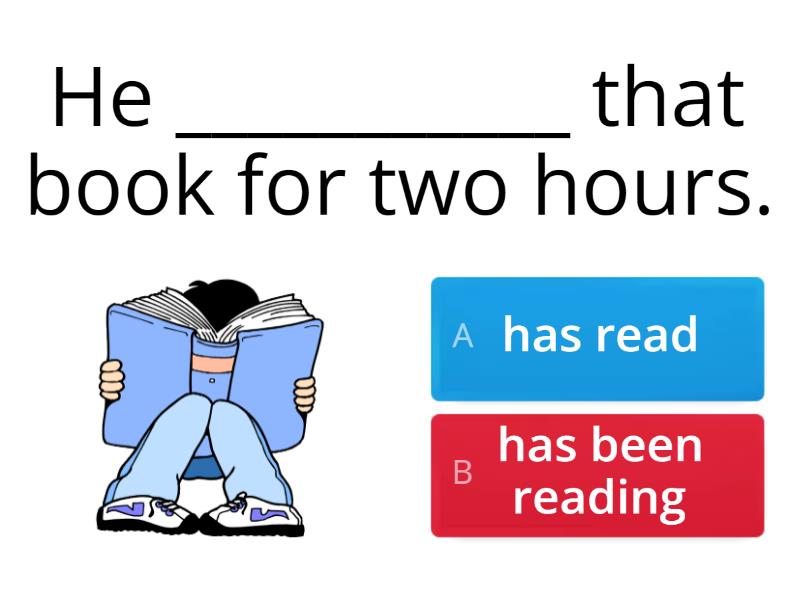 1) He ___________ that book for two hours. a) has read b) has been reading 2) He ___________ 53 pages so far. a) has read b) has been reading 3) Peter __________________ four times. a) has been winning b) has won 4) How long _______________ English? a) have you learned b) have you been learning c) are you learning 5) _______________ any fish? a) Have you caught b) Have you been catching 6) You look tired. What _______________ ? a) have you done b) have you been doing c) did you do 7) How long _______________ as a teacher? a) have you been working b) have you worked c) do you work 8) How long _______________ your wife? a) have you been knowing b) have you known c) do you know 9) _______________ in a factory? a) Have you ever worked b) Have you been working 10) He _______________ in several films. a) has appeared b) has been appearing 11) I think the waiter ____________________ us. a) has been forgetting b) has forgotten c) forgets 12) She _____________ (travel) for 3 months now. She's in the USA at present. a) has been travelling b) has travelled c) is travelling 13) _________ yet? a) Has she been arriving b) Has she arrived c) Is she arriving 14) I __________ my finger a) 've cut b) 've cutting c) 'm cutting 15) Lucy _________ 30 kilometres today. a) has run b) has been running 16) I _______ all morning - I'm fed up! a) 've cleaned b) 've been cleaning c) am cleaning 17) I ________ more water recently, and I feel better. a) 've drunk b) 've been drinking c) am drinking 18) Sorry about the mess! I _______  a) 've baked b) 've been baking 19) How many times ___________ this exam? a) have you taken b) have you been taking 20) Julie ______ dinner. Let's go and eat! a) has cooked b) has been cooking 21) How long _______ in your flat or house? a) have you lived b) have you been living c) are you living