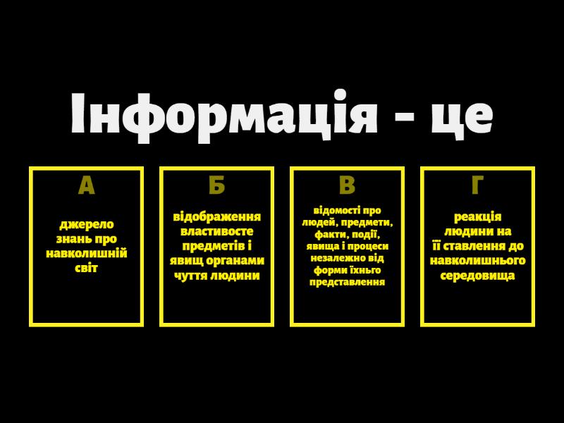 1) Інформація - це a) джерело знань про навколишній світ b) відображення властивосте предметів і явищ органами чуття людини c) відомості про людей, предмети, факти, події, явища і процеси незалежно від форми їхньго представлення d) реакція людини на її ставлення до навколишнього середовища 2) Вплив засобів масової інформації на здоров'я буває: a) задовільним b) незадовільним c) негативним d) нейтральним 3) Позначте позитивний вплив засобів масової інформації a) Інформують про важливі події b) можуть сформувати залежність c) нав'язують певний спосіб життя d) можуть провокувати формування шкідливих звичок 4) Щоб протидіяти можливому негативному впливу засобів масової інформації не варто: a) активно відпочивати b) оцінювати інформацію критично c) вірити всьому беззаперечно d) обирати для перегляду передачі, що пропагадують загальнолюдьські цінності 5) Якщо проводити за комп'ютером багато часу,то: a) це не нашкодить здоров'ю b) може виникнути залежність c) це сприяє удосконаленню пам'яті d) може покращитися постава 6) Щоб користуватися інтернетом безпечно, слід a) повідомляти пароль усім користувачам b) повідомляти незнайомцям особисті дані c) не повідомляти без дозволу близьких особисту інформацію d) не розповідати нікому про можливі неприємні повідомлення 7) Мислити критично означає:( 3 відповіді) a) усе критикувати b) ретельно обмірковувати судження c) приймати рішення не розмірковуючи d) не оцінювати різних варіантів рішення e) не приймати рішення під впливом емоцій f) приймати рішення після оцінювання різних варіантів 8) Позначте позитивний вплив засобів інформації a) провокують порушення розпорядку дня b) спричиняють перевтому і дратівливість c) пропагують загальнолюдські цінності d) нав'язують певну поведінку 9) Якщо проводити за комп'ютером багато часу, то: a) поліпшується настрій та здоров'я b) можна заспокоїтись та зосередитися c) підвищується гострота зору d) погіршується фізичний і психологічний стан здоров'я 10) Щоб протидіяти можливому негативному впливу засобів масової інформації, слід: a) захоплюватися комп'ютерними іграми b) наслідувати героїв рекламних роликів c) розвивати навички критичного мислення d) вірити всьому беззаперечно