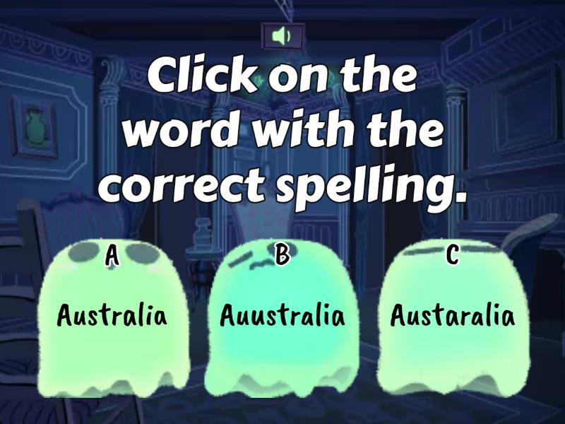 1) Click on the word with the correct spelling. a) frend b) friend c) frieend 2) Click on the word with the correct spelling. a) Australia b) Auustralia c) Austaralia 3) Click on the word with the correct spelling. a) beautful b) beautiful c) butiful 4) Click on the word with the correct spelling. a) because b) becuse c) becos 5) Click on the word with the correct spelling. a) beginning b) begining c) beginnning 6) Click on the word with the correct spelling. a) enuf b) enuff c) enough 7) Click on the word with the correct spelling. a) usually b) usualy c) usuually 8) Click on the word with the correct spelling. a) Februuary b) Februry c) February 9) Click on the word with the correct spelling. a) famuous b) famous c) famus 10) Click on the word with the correct spelling. a) differrent b) different c) diferent