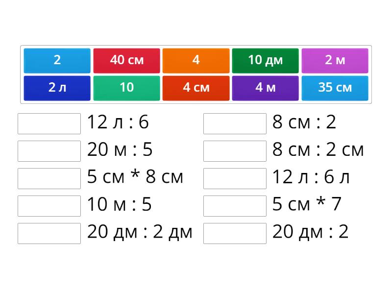 4 см - 8 см : 2 , 10 - 20 дм : 2 дм , 4 м - 20 м : 5 , 40 см - 5 см * 8 см , 4 - 8 см : 2 см , 10 дм - 20 дм : 2 , 2 м - 10 м : 5 , 35 см - 5 см * 7 , 2 л - 12 л : 6, 2 - 12 л : 6 л ,