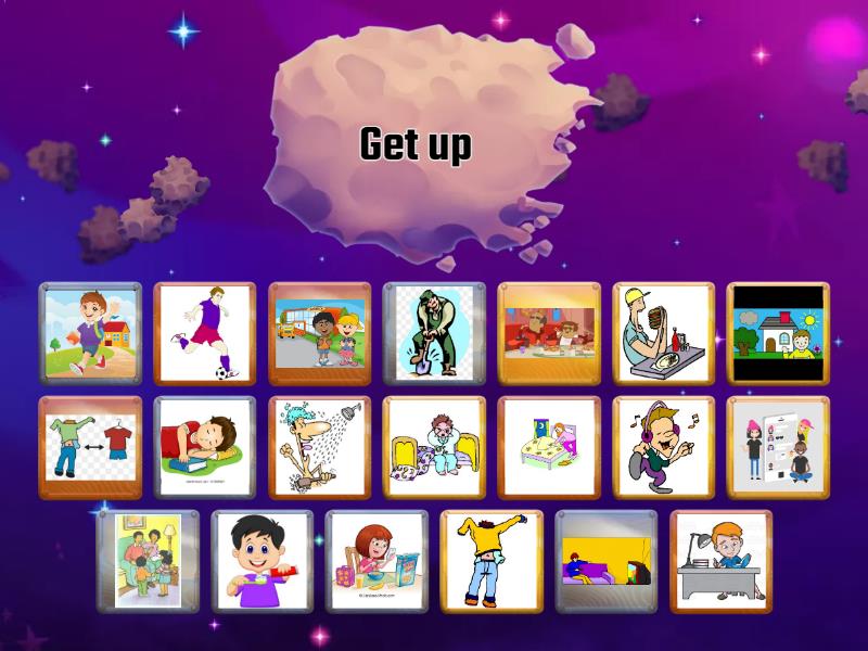 Get up, Brush my teeth, Take a shower, Get dressed, have breakfast, Go to school, have lunch, Go home, Change clothe, have dinner, Watch tv, Do homework, Chat with friends, Talk to my family, Go to bed, Live, Work, Play soccer, Listen to music, Sleep,