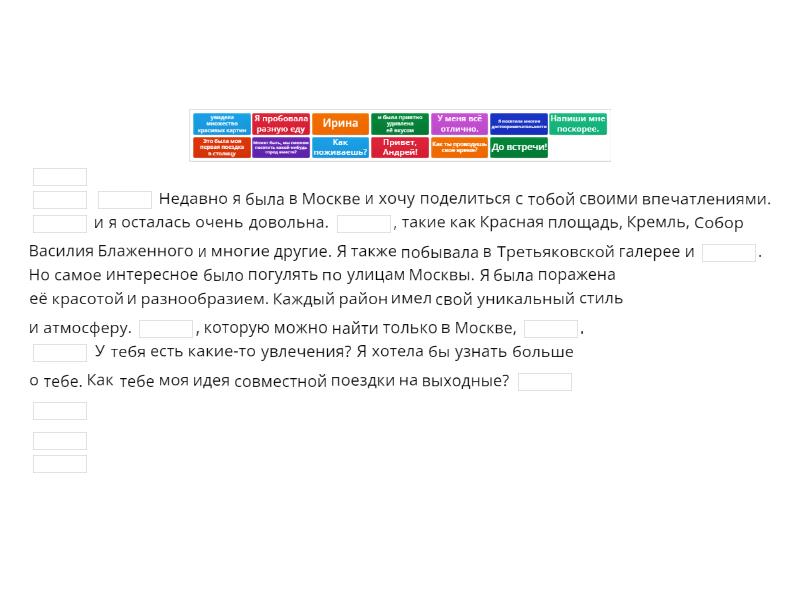 ____ ____ ____ Недавно я была в Москве и хочу поделиться с тобой своими впечатлениями. ____ и я осталась очень довольна. ____, такие как Красная площадь, Кремль, Собор Василия Блаженного и многие другие. Я также побывала в Третьяковской галерее и ____. Но самое интересное было погулять по улицам Москвы. Я была поражена её красотой и разнообразием. Каждый район имел свой уникальный стиль и атмосферу. ____, которую можно найти только в Москве, ____. ____ У тебя есть какие-то увлечения? Я хотела бы узнать больше о тебе. Как тебе моя идея совместной поездки на выходные? ____ ____ ____ ____
