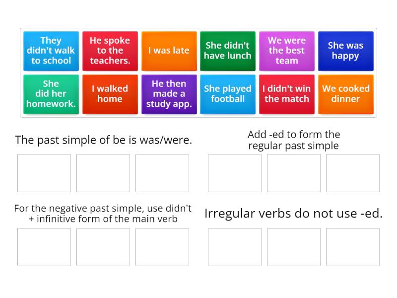The past simple of be is was/were.: I was late, She was happy, We were the best team, Add -ed to form the regular past simple: I walked home, She played football, We cooked dinner, For the negative past simple, use didn’t + infinitive form of the main verb: I didn't win the match, She didn't have lunch, They didn't walk to school, Irregular verbs do not use -ed.: He then made a study app. , He spoke to the teachers., She did her homework.,