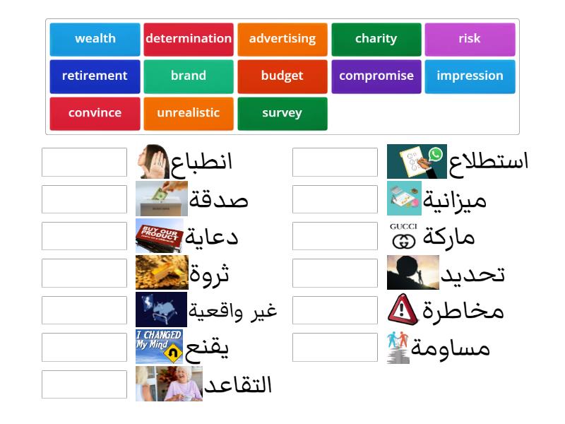 retirement - التقاعد, survey - استطلاع, unrealistic - غير واقعية, impression - انطباع, wealth - ثروة, charity - صدقة, compromise - مساومة, convince - يقنع, determination - تحديد, risk - مخاطرة, brand - ماركة, advertising - دعاية, budget - ميزانية,