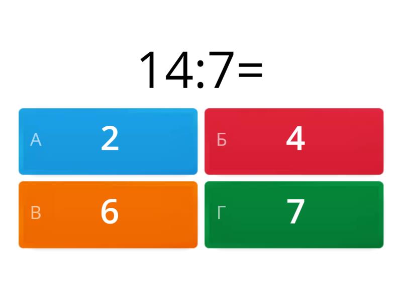 1) 14:7= a) 2 b) 4 c) 6 d) 7 2) 10.7= a) 20 b) 50 c) 70 d) 30 3) 63:7= a) 4 b) 9 c) 8 d) 5 4) 3.7= a) 18 b) 21 c) 15 d) 34 5) 56:7= a) 4 b) 7 c) 5 d) 8 6) 7.4= a) 15 b) 28 c) 32 d) 45 7) 49:7= a) 7 b) 5 c) 4 d) 6 8) 7.5= a) 64 b) 42 c) 35 d) 27 9) 42:7= a) 6 b) 4 c) 7 d) 3 10) 7.7= a) 27 b) 54 c) 63 d) 49