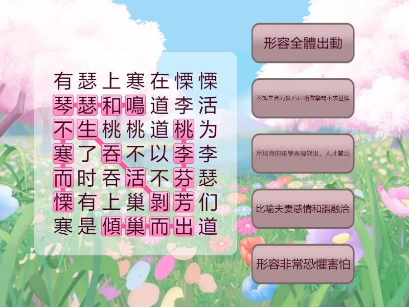 琴瑟和鳴 - 比喻夫妻感情和諧融洽, 不寒而慄 - 形容非常恐懼害怕, 傾巢而出 - 形容全體出動, 桃李芬芳 - 所培育的後學表現傑出,人才輩出, 生吞活剝 - 不加烹煮而食,也比喻做學問不求甚解,