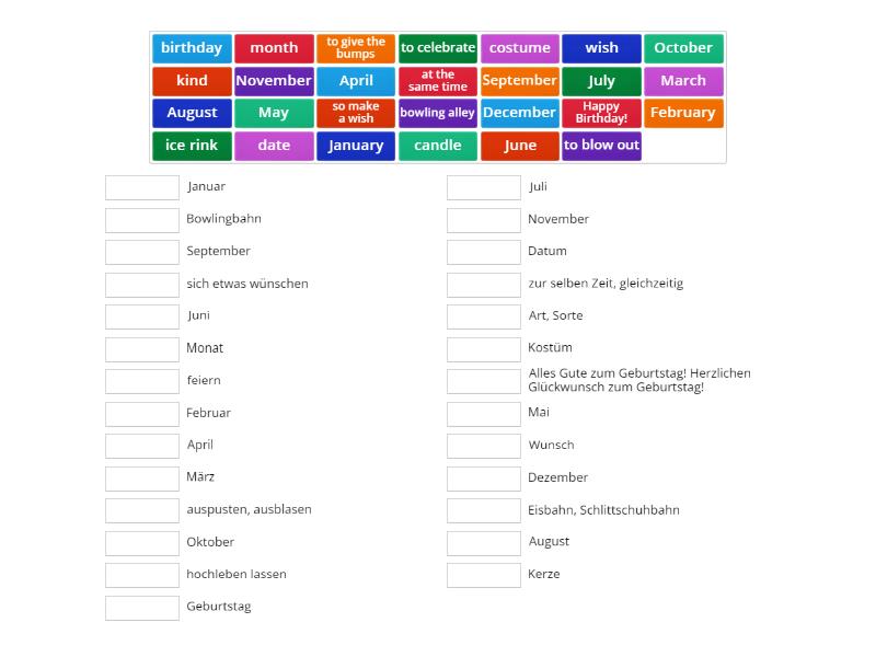 costume - Kostüm, at the same time - zur selben Zeit, gleichzeitig, bowling alley - Bowlingbahn, to give the bumps - hochleben lassen, to celebrate - feiern, birthday - Geburtstag, ice rink - Eisbahn, Schlittschuhbahn, to blow out - auspusten, ausblasen, candle - Kerze, so make a wish - sich etwas wünschen, wish - Wunsch, Happy Birthday! - Alles Gute zum Geburtstag! Herzlichen Glückwunsch zum Geburtstag!, kind - Art, Sorte, date - Datum, January - Januar, February - Februar, March - März, April - April, May - Mai, June - Juni, July - Juli, August - August, September - September, October - Oktober, November - November, December - Dezember, month - Monat,