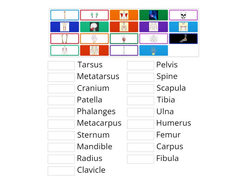 Cranium, Spine, Pelvis, Femur, Scapula, Clavicle, Carpus, Fibula, Tibia, Humerus, Mandible, Metacarpus, Metatarsus, Patella, Phalanges, Radius, Sternum, Tarsus, Ulna,