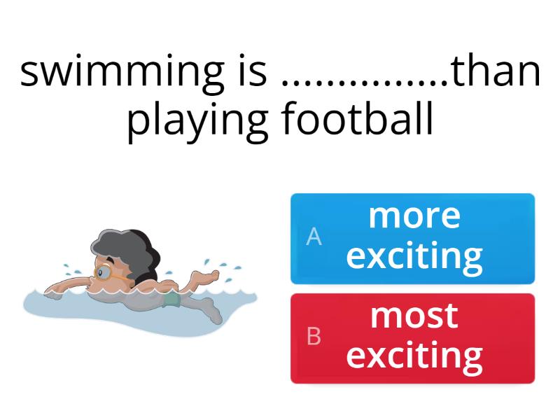 1) swimming is ...............than playing football a) more exciting b) most exciting 2) scuba diving is ........ than swimming a) more dangerous b) most dangerous 3) I think football is ......... sport a) more boring b) the most boring 4) Jane thinks pottery is .........than painting a) more difficult b) the most difficult 5) Art is the ____________ interesting subject! a) most b) more