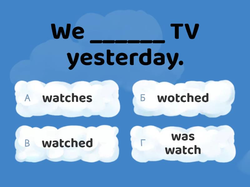 1) We ______ TV yesterday. a) watches b) wotched c) watched d) was watch 2) Yesterday evening Tim _____ chess. a) play b) plays c) played d) eat 3) Kim _____ play with her favourite toy last week. a) haven’t b) doesn’t c) didn’t d) don’t 4) ____ you like the film? (смотрели вчера)  a) Have b) Do c) Does d) Did 5) I _____ in London. (раньше) a) lived b) live c) lives d) do live 6) He _____ cupcakes for breakfast. (ел) a) eat b) ate c) aete d) eats 7) His friends ____ to see him yesterday. a) come b) came c) comed 8) Richard ____ seven last year. a) is b) did c) was d) will be 9) His parents ____ at home yesterday eve-ning. a) was b) is c) were d) shall 10) Mr Cat ___ in London last week. a) were b) are c) was d) went