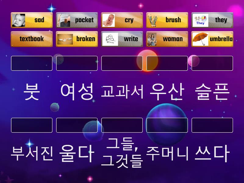 cry - 울다, they - 그들, 그것들, broken - 부서진, write - 쓰다, pocket - 주머니, umbrella - 우산, textbook - 교과서, woman - 여성, sad - 슬픈, brush - 붓,