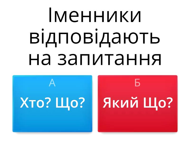 1) Іменники відповідають на запитання a) Хто? Що? b) Який Що? 2) На які запитання відповідають слова – назви істот? a) Що? b) Хто? 3) Які слова відповідають на питання Хто? a) рибка b) ручка 4) Виберіть слова назви предметів? a) гарна b) картина 5) Оберіть слова їжак в однині, а в множині. a) їжачок b) їжачки 6) Імена пишуться з якої букви. a) великої b) малої 7) Із великої букви пишуться a) назви рослин b) клички тварин 8) Назви міст, сіл, річок пишуться… a) із великої букви b) з нового рядка 9) Як можна назвати вулицю біля лісу? a) Лісова b) Берегова 10) Запиши по батькові хлопчика, якого батько називається Петро a) Максимович b) Петрович 11) До якої групи можна віднести слова: яблука, груші, сливи, вишні? a) фруктів b) овочів