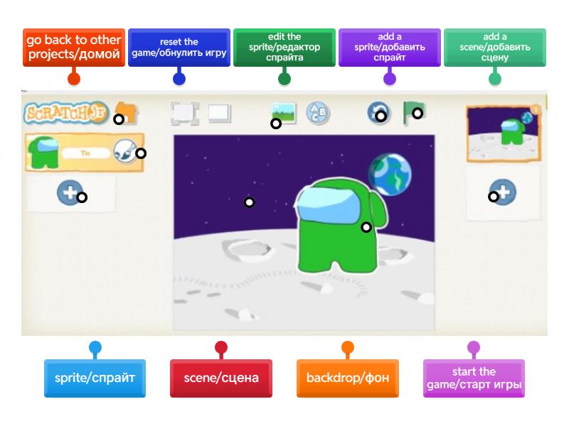 sprite/спрайт, scene/сцена, backdrop/фон, edit the sprite/редактор спрайта, start the game/старт игры, reset the game/обнулить игру, add a scene/добавить сцену, go back to other projects/домой, add a sprite/добавить спрайт.