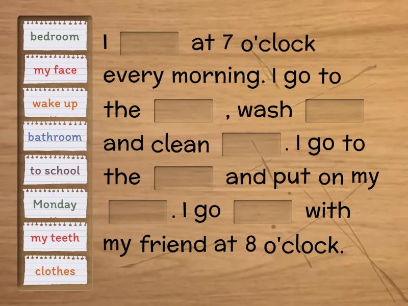 I ____ at 7 o'clock every morning. I go to the ____ , wash ____ and clean ____. I go to the ____ and put on my ____. I go ____ with my friend at 8 o'clock.