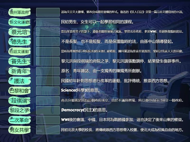 段祺瑞 - 曾為某袁姓男子的部下,遵循老闆想壞壞之風氣,掌控北京政府、參加WWI、拒絕恢復臨時約法。, 護法 - 不是長髮、也不是短髮,而是保護臨時約法,由孫中山領導發起。, 廣州軍政府 - 南北分裂就是因為這個政府成立,由於不滿段祺瑞,所以孫中山自己成立一個政府。, 二次革命 - 當時為準閣揆(行政院院長)的宋教仁被暗殺,國民黨認為是袁世凱殺的,發起討伐袁大大的活動。, 新文化運動 - 民國初年針對思想進行改革的運動,批評傳統、推崇西方思想。, 新青年 - 原名:青年雜誌,由一支獨秀的陳獨秀所創辦。, 蔡元培 - 民初北京大學的校長,將傳統跟西方思想帶入校園,使北大成為校風自由的地方。, 白話文運動 - 認為文言文太難懂,要改良成簡單易懂的形式。魯迅的《狂人日記》是第一篇以此文體寫出的小說。, 德先生 - Democracy(民主)的意思。, 賽先生 - Science(科學)的意思。, 巴黎和會 - WWI後的會議,中國、日本同為戰勝國參加,這也決定了後來山東的權益。, 男女共學 - 民初男生、女生可以一起學習相同的課程。, 黎段之爭 - 黎元洪與段祺瑞的府院之爭,黎元洪請張勳調停,結果發生復辟事件。,