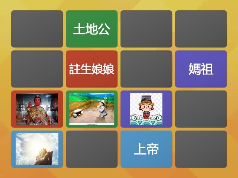 土地公, 媽祖, 註生娘娘, 上帝, 耶穌, 關聖帝君, 財神爺, 月老,