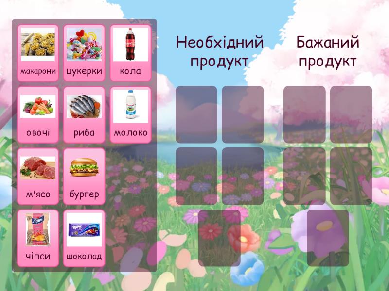 Необхідний продукт: молоко, м'ясо, риба, овочі, макарони, Бажаний продукт: шоколад, кола, чіпси, бургер, цукерки,