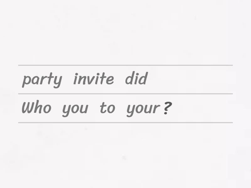 Who did you invite to your party?, Who travelled by boat to the island?, Who took you to the airport?, Who did Hannah stay with?, Who did you meet yesterday?, Who told you the answer?, Who did you go on holiday with?,