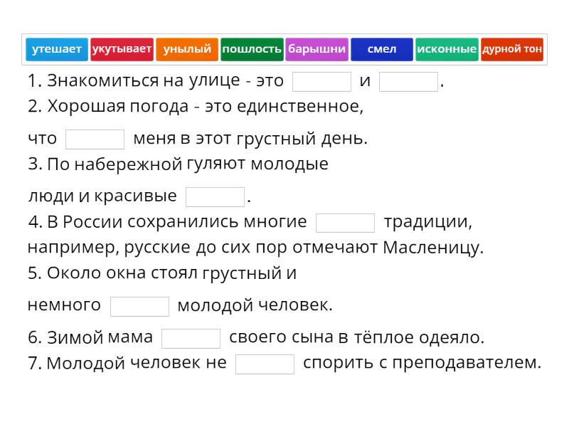 1. Знакомиться на улице - это ____ и ____. 2. Хорошая погода - это единственное, что ____ меня в этот грустный день. 3. По набережной гуляют молодые люди и красивые ____. 4. В России сохранились многие ____ традиции, например, русские до сих пор отмечают Масленицу. 5. Около окна стоял грустный и немного ____ молодой человек. 6. Зимой мама ____ своего сына в тёплое одеяло. 7. Молодой человек не ____ спорить с преподавателем.