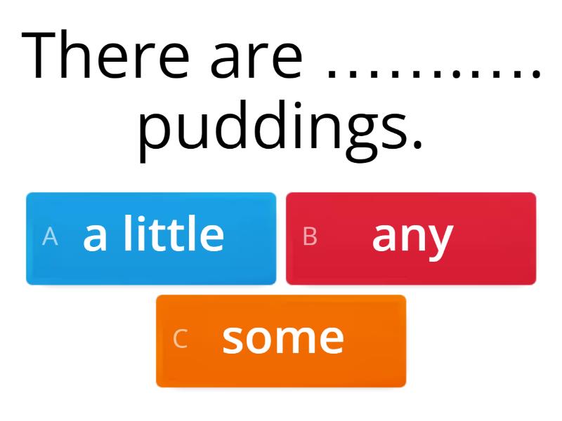 1) There are …….…. puddings. a) a little b) any c) some 2) There are …….…. fruits. a) a little b) a few c) any 3) Is there …….…. fish?  a) any b) some c) a few 4) There is …….…. rice in the cupboard. a) a few b) any c) a little 5) There are …….…. raisins. a) some b) a little c) any 6) There are …….…. fruits. a) some b) a little c) any 7) There is …….…. rice. a) a lot of b) a little c) any 8) There aren’t …….…. apples. a) any b) a little c) some 9) Is there …….…. salad?  a) a few b) any c) some 10) There are …….…. puddings. a) a little b) any c) some 11) There aren’t …….…. vegetables in the kitchen. a) some b) any c) a little 12) There are …….…. bananas on the table. a) any b) a little c) some 13) There isn’t …….…. meat. a) any b) a few c) some 14) There aren’t …….…. onions. a) any b) a little c) some 15) Adrián eats …….…. bread rolls in the morning. a) a little b) any c) a lot of 16) There isn’t …….…. chicken in the fridge. a) a little b) any c) some 17) There is …….…. coffee in the cup. a) some b) a few c) any 18) Fran drinks …….…. milk. a) a little b) a few c) any 19) There aren't …….…. potatoes. a) any b) a few c) some 20) There aren’t …….…. eggs on the table. a) a little b) some c) any 21) There are …….…. cherries. a) some b) any c) a little 22) There are …….…. nuts. a) a lot of b) a little c) a few 23) There is …….…. sugar. a) any b) a few c) some 24) There is …….…. milk in the kitchen. a) any b) a few c) some 25) There isn’t …….…. chocolate. a) a few b) any c) some 26) Are there …….…. puddings? a) a little b) any c) some 27) There aren’t …….…. mushrooms. a) a little b) any c) some 28) There is …….…. water. a) a little b) any c) a few 29) Is there …….…. nuts?  a) a little b) some c) any 30) There is …….…. fish. a) some b) any c) a little 31) There isn't …….…. fruit. a) some b) any c) a little 32) There is …….…. milk. a) any b) a little c) a few 33) There are …….…. nuts. a) any b) a little c) a few