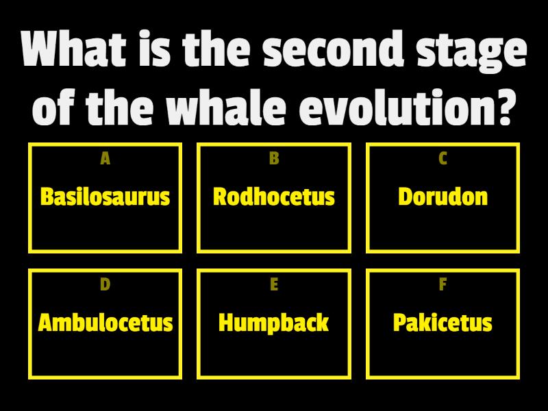 1) What is the second stage of the whale evolution? a) Basilosaurus b) Rodhocetus c) Dorudon d) Ambulocetus e) Humpback f) Pakicetus 2) What is Charles Darwin's famous book about evolution called? a) The theory of evolution b) The theory of species c) The galapagos finches d) Diary of the Beagle e) The origin of evolution f) On the origin of species 3) In 1895 what was the percentage of black and white peppered moths? a) 98% black and 2% white b) 50% black and 50% white c) 4% black and 96% white d) 43% black and 57% white e) 96% black and 4% white f) 2% black and 98% white 4) How many years did Darwin stay on the beagle? a) 13 Years b) 8 years c) 5 years d) 3 years e) 4 years and 2 months f) 20 months 5) What is natural selection? a) nature will select people to be the best b) species who are better suited to their environment will survive others will not c) the god of nature will select a species to be the most powerful d) an unknown being selecting the worthy e) a tree dropping an apple on you f) a prophecy in the sky 6) which of these scientists inspired Darwin's theory? a) Albert Einstein b) Isaac Newton c) Steven Hawking d) Galileo Gallei e) Jean Baptist Lamarck f) Marie Curie 7) Name a polar bears habitat a) Desert b) Arctic c) Rainforest d) Forest e) Coral reef f) Ocean 8) Which of these are a thing a camel has ? a) fur to keep warm in cold days b) 3 humps c) same colour as the sand in desert d) long eyelashes to protect to from sand 9) When was Darwin born? a) 12 feb 1809 b) 14 mar 1806 c) 23 oct 1801 d) 1 jan 1818 e) 28 sep 1823 f) 16 dec 1799