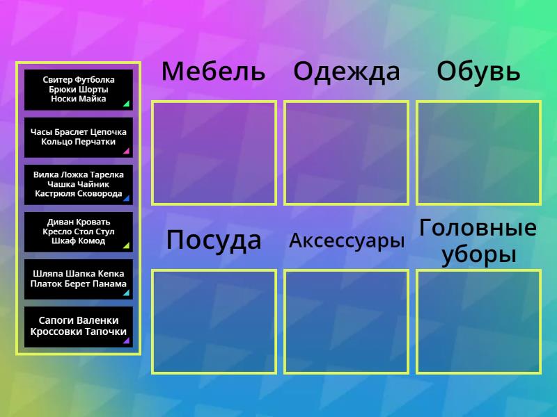 Мебель: Диван Кровать Кресло Стол Стул Шкаф Комод , Одежда: Свитер Футболка Брюки Шорты Носки Майка , Обувь : Сапоги Валенки Кроссовки Тапочки , Посуда: Вилка Ложка Тарелка Чашка Чайник Кастрюля Сковорода , Аксессуары: Часы Браслет Цепочка Кольцо Перчатки, Головные уборы: Шляпа Шапка Кепка Платок Берет Панама ,