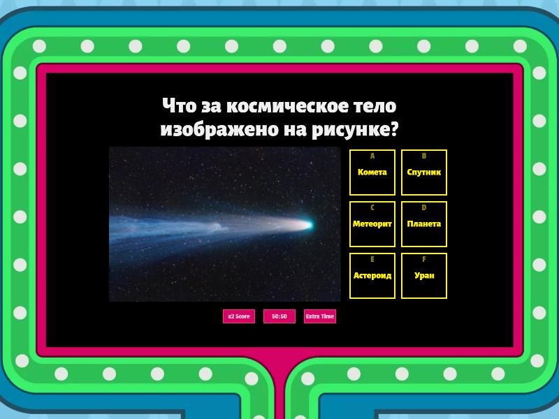 1) Что за космическое тело изображено на рисунке? a) Комета b) Спутник c) Метеорит d) Планета e) Астероид f) Уран 2) Что за космическое тело изображено на рисунке? a) Комета b) Спутник c) Метеорит d) Планета e) Астероид f) Уран 3) Что за космическое тело изображено на рисунке? a) Комета b) Спутник c) Метеорит d) Планета e) Астероид f) Уран 4) Что за космическое тело изображено на рисунке? a) Комета b) Спутник c) Метеорит d) Планета e) Астероид f) Уран 5) Какая галактика изображена на рисунке? a) Андромеда b) Млечный путь c) Тадпол d) ЛМС 6) На какой планете возможен дождь из алмазов? a) Плутон b) Марс c) Венера d) Земля e) Нептун f) Сатурн 7) Какая планета ближайшая к Солнцу? a) Меркурий b) Сатурн c) Земля d) Марс e) Нептун f) Плутон 8) Кто первый побывал в космосе? a) Армстронг b) Селлерс c) Леонов d) Гагарин e) Шепард f) Падалка 9) Кто первый вступил на Луну? a) Армстронг b) Селлерс c) Леонов d) Гагарин e) Шепард f) Падалка 10) Какая планета имеет свой спутник? a) Меркурий b) Марс c) Земля d) Венера e) Юпитер f) Сатурн 11) Первая женщина в космеса была.... a) Армстронг b) Гагарин c) Леонов d) Бондар e) Райд f) Терешкова 12) Какого цвета солнце? a) Желтый b) Белый c) Красный d) Розовый e) Черный f) Ярко желтый 13) Что такое космический мусор? a) Искуственный обьект, который остался в космосе b) Астероиды c) Кометы d) Карликовые планеты e) Звезды f) Спутники 14) На какой планете скорость ветра выше сверхзвуковой? a) Нептун b) Уран c) Марс d) Венера e) Земля f) Юпитер 15) В каком порядке правильно расположена последовательность планет? a) Меркурий, Венера, Земля, Марс, Сатурн, Юпитер Плутон. b) Меркурий, Венера, Марс, Земля, Юпитер, Сатурн, Уран, Нептун, Плутон. c) Венера, Меркурий Земля, Марс, Юпитер, Сатурн, Уран, Нептун, Плутон. d) Марс, Венера, Земля, Меркурий, Юпитер, Сатурн, Уран, Нептун, Плутон. e) Меркурий, Венера, Земля, Марс, Юпитер, Сатурн, Уран, Нептун, Плутон. f) Меркурий, Венера, Земля, Марс, Юпитер, Плутон, Сатурн, 16) Какая самая плотная планета в солнечной системе? a) Меркурий b) Нептун c) Сатурн d) Земля e) Марс f) Юпитер . 17) На какой планете больше всего вулканов a) Уран b) Плутон c) Земля d) Венера e) Марс f) Нептун 18) Какая звезда центр солнечной системы? a) Вега b) Альтаир c) Бетельгейзе d) Сириус e) Солнце f) Полярная 19) За сколько дней Луна совершает полный оборот вокруг Земли? a) 27 b) 29 c) 30 d) 21 e) 10 f) 1 20) Что изучает звезды планеты, галактики? a) Астрономия b) Обществознание c) Математика d) Физика e) ОБЖ f) Биология
