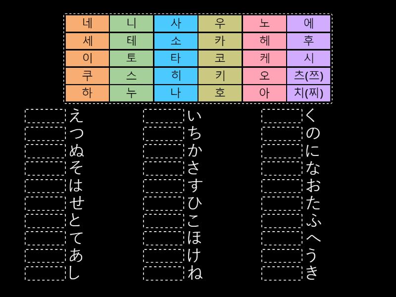 아 - あ, 이 - い, 우 - う, 에 - え, 오 - お, 카 - か, 키 - き, 쿠 - く, 케 - け, 코 - こ, 사 - さ, 시 - し, 스 - す, 세 - せ, 소 - そ, 타 - た, 치(찌) - ち, 츠(쯔) - つ, 테 - て, 토 - と, 나 - な, 니 - に, 누 - ぬ, 네 - ね, 노 - の, 하 - は, 히 - ひ, 후 - ふ, 헤 - へ, 호 - ほ,