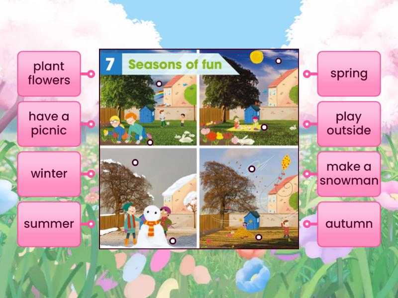 spring, summer, winter, autumn, have a picnic, plant flowers, make a snowman, play outside.
