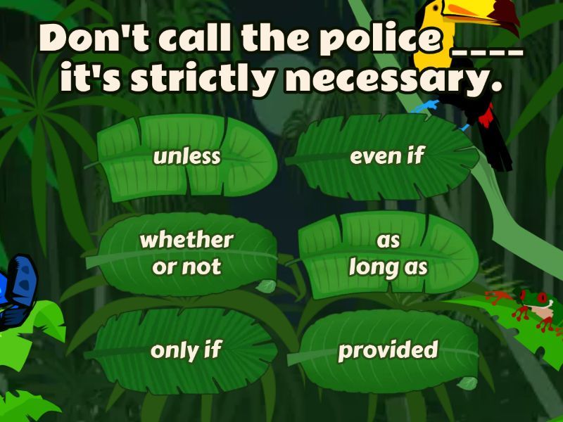 1) Don't call the police ____ it's strictly necessary. a) unless b) even if c) whether or not d) as long as e) only if f) provided 2) The exam was too difficult. I wouldn't have passed ____ I had studied harder. a) unless b) even if c) whether or not d) as long as e) only if f) provided 3) _____ you could spend 15$ every hour. How much could you spend in a year? a) Unless b) Even if c) Whether or not d) Suppose e) Only if f) Provided 4) I'll talk to the press _____ they don't reveal my identity. a) unless b) even if c) whether or not d) on condition that e) only if f) provided 5) You should stop drinking _____ you have an addiction problem. Alcohol is just not healthy. a) unless b) even if c) whether or not d) on condition that e) only if f) provided 6) We should take a jacket _____ it's cold when we arrive. a) unless b) even if c) whether or not d) on condition that e) in case f) provided 7) I don't mind how you spend the money _____ you stick to the budget. a) as long as b) even if c) whether or not d) on condition that e) in case f) provided 8) Bees sting _____ they feel threatened. a) as long as b) only if c) whether or not d) on condition that e) in case f) provided 9) _____ you say sorry a thousand times, you can't change what you've done. a) As long as b) Even if c) Whether or not d) On condition that e) In case f) Provided 10) You're free to do whatever you want _____ you respect the rules. a) As long as b) Even if c) Whether or not d) On condition that e) In case f) Provided
