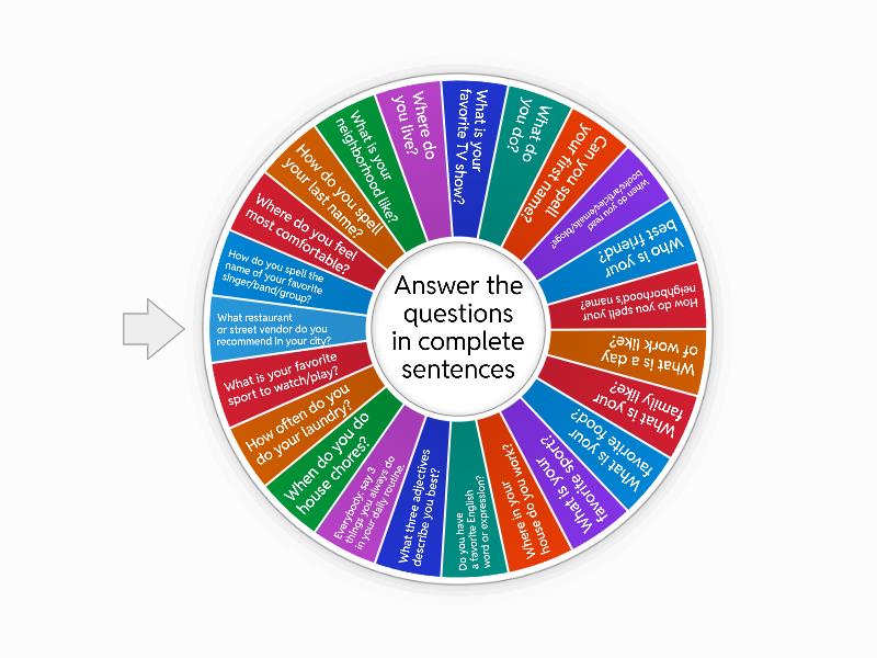 1) How do you spell the name of your favorite singer/band/group? 2) Where do you feel most comfortable? 3) How do you spell your last name? 4) What is your neighborhood like? 5) Where do you live? 6) What is your favorite TV show? 7) What do you do? 8) Can you spell your first name? 9) When do you read books/articles/emails/blogs? 10) Who is your best friend? 11) How do you spell your neighborhood's name?  12) What is a day of work like? 13) What is your family like? 14) What is your favorite food? 15) What is your favorite sport? 16) Where in your house do you work? 17) Do you have a favorite English word or expression? 18) What three adjectives describe you best? 19) Everybody: say 3 things you always do in your daily routine. 20) When do you do house chores? 21) How often do you do your laundry? 22) What is your favorite sport to watch/play? 23) What restaurant or street vendor do you recommend in your city?