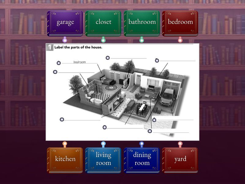 bedroom, bathroom, kitchen, dining room, living room, garage, yard, closet.