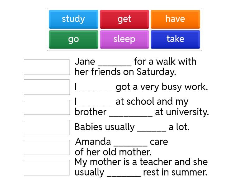study - I _______ at school and my brother _________ at university., tidy up - Tom _________ his room every weekend., sing - My friends often _______ songs at karaoke., go - Jane _______ for a walk with her friends on Saturday., read - When I want to relax, I _________ magazines or books., chat - In the evenings I read messages from my friends and _____ with them., listen - Jerry ______ to rock music but I like pop., sleep - Babies usually ______ a lot., do - Sportsmen usually ______ exercise nearly every day., take - Amanda _______ care of her old mother., have - I _______ got a very busy work., get - My mother is a teacher and she usually _______ rest in summer.,