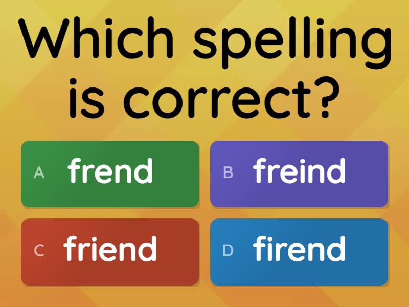 1) Which spelling is correct? a) frend b) freind c) friend d) firend 2) Which spelling is correct? a) beatiful b) beatifull c) beautiful d) beautifull 3) Which spelling is correct? a) becos b) becous c) becouse d) because 4) Which spelling is correct? a) information b) infomation c) informasion d) infomashun 5) Which spelling is correct? a) doughter b) dauhgter c) daugter d) daughter 6) Which spelling is correct? a) wembly b) Wembely c) wembley d) Wembley 7) Which spelling is correct? a) college b) colege c) colage d) colledge 8) Which spelling is correct? a) studant b) student c) studnt d) studont 9) Which spelling is correct? a) nieghbour b) neighbour c) neghbour d) nieghbor 10) Which spelling is correct? a) expensif b) ekspensive c) expensiv d) expensive 11) Which spelling is correct? a) breakfast b) brekfast c) brekfeast d) breakfest 12) Which spelling is correct? a) difrent b) diferent c) different d) differrent 13) Which spelling is correct? a) traffic b) traffik c) trafic d) trafick 14) Which spelling is correct? a) cofee b) coffe c) caffee d) coffee 15) Which spelling is correct? a) nors b) norse c) nurse d) nurs 16) Which spelling is correct? a) apointment b) appoitment c) appointmet d) appointment 17) Which spelling is correct? a) restaraunt b) restoraunt c) restaurant d) restauraunt 18) Which spelling is correct? a) saturday b) Saturday c) Saterday d) sataday 19) Which spelling is correct? a) plese b) plase c) please d) pleese 20) Which spelling is correct? a) speshul b) specail c) speciale d) special 21) Which spelling is correct? a) delicious b) deliciouse c) delicose d) deliciose 22) Which spelling is correct? a) difikult b) diffikult c) dificult d) difficult 23) Which spelling is correct? a) tradisional b) traditional c) traditonal d) tarditional 24) Which spelling is correct? a) jorney b) journey c) jorunay d) journay 25) Which spelling is correct? a) vegetables b) vegtables c) vegteables d) vejetables 26) Which spelling is correct? a) wether b) wather c) waether d) weather 27) Which spelling is correct? a) usually b) usaully c) usualy d) uzually 28) Which spelling is correct? a) weeknd b) weekend c) wekeend d) wekend 29) Which spelling is correct? a) Wendsday b) Wednsday c) Wednesday d) Wendseday 30) Which spelling is correct? a) umbrela b) ombrela c) umbrola d) umbrella 31) Which spelling is correct? a) peopel b) poeple c) peepil d) people 32) Which spelling is correct? a) countery b) country c) cuntry d) cuontry 33) Which spelling is correct? a) children b) chidren c) childeren d) chidlren 34) Which spelling is correct? a) tiket b) tikcet c) ticket d) ticet 35) Which spelling is correct? a) problem b) porblem c) prolbem d) probelem 36) Which spelling is correct? a) cloeths b) clotheses c) clothes d) kloths 37) Which spelling is correct? a) Tursday b) Thursdy c) thurdsay d) Thursday 38) Which spelling is correct? a) husband b) husbond c) housband d) hasbund 39) Which spelling is correct? a) hapy b) happy c) hapey d) hopey 40) Which spelling is correct? a) huose b) hause c) hous d) house 41) Which spelling is correct? a) maney b) muny c) mony d) money 42) Which spelling is correct? a) smal b) small c) smol d) smoll 43) Which spelling is correct? a) sometimes b) sumtimes c) soumtimes d) sametimes 44) Which spelling is correct? a) vist b) vizt c) visite d) visit