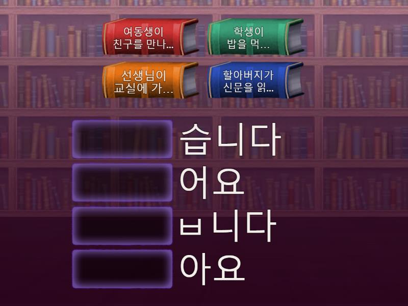선생님이 교실에 가… - ㅂ니다, 할아버지가 신문을 읽... - 습니다, 여동생이 친구를 만나... - 아요, 학생이 밥을 먹… - 어요,