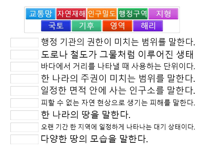 교통망 - 도로나 철도가 그물처럼 이루어진 생태, 인구밀도 - 일정한 면적 안에 사는 인구소를 말한다., 자연재해 - 피할 수 없는 자연 현상으로 생기는 피해를 말한다., 기후 - 오랜 기간 한 지역에 일정하게 나타나는 대기 상태이다., 지형 - 다양한 땅의 모습을 말한다., 행정구역 - 행정 기관의 권한이 미치는 범위를 말한다., 해리 - 바다에서 거리를 나타낼 때 사용하는 단위이다., 영역 - 한 나라의 주권이 미치는 범위를 말한다., 국토 - 한 나라의 땅을 말한다.,