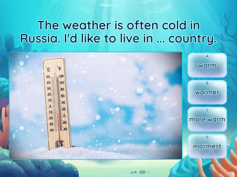 1) The weather is often cold in Russia. I'd like to live in ... country. a) warm b) warmer c) more warm d) mormest 2) Tigers are ... animals in the zoo.  a) the dangerousest b) more dangerous c) the most dangerous 3) It's ... to go to Moscow by train than by plane.  a) cheapest b) cheaper c) more cheap 4) This theatre is 245 years old. It's ... theatre in the city. a) older b) the most old c) the oldest 5) The weather was good yesterday, but today it's ... a) well b) better c) best d) gooder 6) I don't like the film. It is ... film in my life. a) the baddest b) worse c) the worst 7) The Chinese language is ... than English. a) difficultly b) more difficult c) the most difficult 8) My brother is very tall. I'm ... than him. a) short b) more shorter c) the shortest d) shorter 9) I think football ... sport in the world. a) the most popular b) the populerest c) more popular 10) My sister is only 18, she's ... than me. a) more young  b) younger c) the youngest 11) I tidy my room every day so it is ... room in our house. a) the cleanest b) the most clean c) more cleanest 12) I like that restaurant very much. It has ... dishes. a) goodest b) better c) the best 13) Robert always gets good marks. He's ... student in our group.  a) the clever b) the most cleverest c) the cleverest