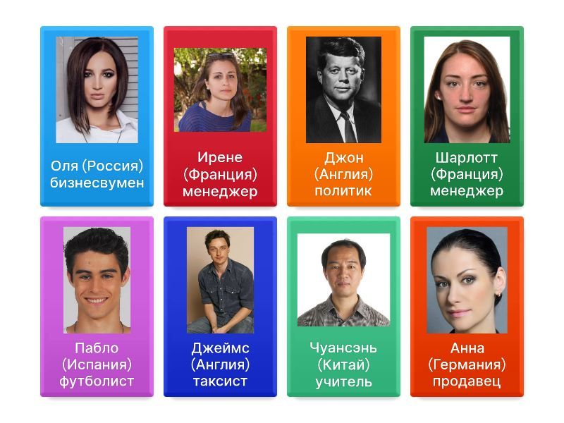 Анна (Германия) продавец - Анна немка, она по профессии продавец, Пабло (Испания) футболист - Пабло испанец, он по профессии футболист, Ирене (Франция) менеджер - Ирене француженка. Она по профессии менеджер, Джон (Англия) политик - Джон Англичанин, он по профессии политик, Оля (Россия) бизнесвумен - Оля русская, она по профессии бизнесвумен, Шарлотт (Франция) менеджер - Шарлотт француженка, она по профессии менеджер, Джеймс (Англия) таксист - Джеймс англичанин, он по профессии таксист, Чуансэнь (Китай) учитель - Чуансэнь китаец, он по профессии учитель,