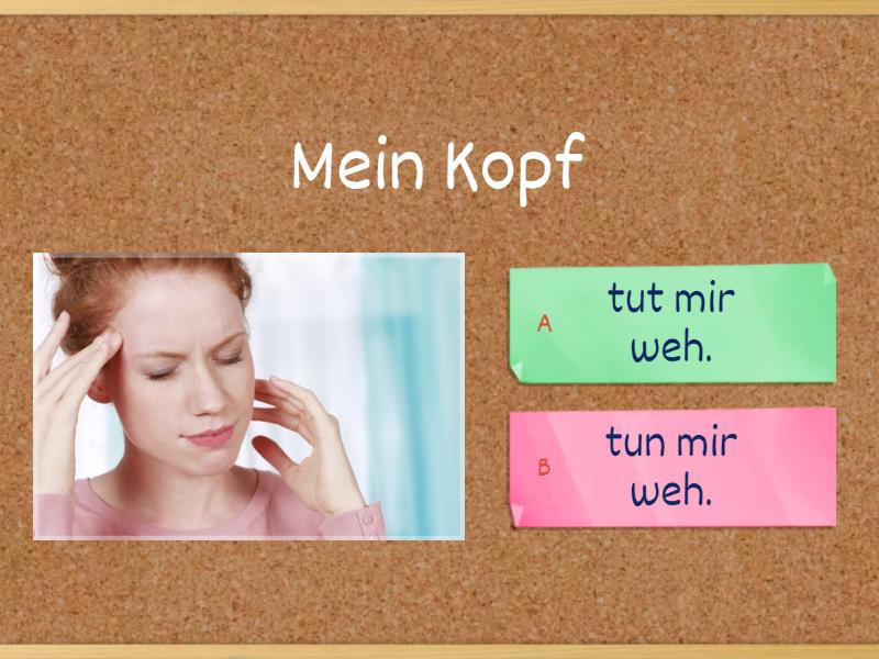 1) Mein Kopf a) tut mir weh. b) tun mir weh. 2) Meine Ohren a) tut mir weh. b) tun mir weh. 3) Mein Arm a) tut mir weh. b) tun mir weh. 4) Meine Hände a) tut mir weh. b) tun mir weh. 5) Meine Nase ... a) tut mir weh. b) tun mir weh. 6) Mein Bauch a) tut mir weh. b) tun mir weh. 7) Meine Füße a) tut mir weh. b) tun mir weh. 8) Meine Zähne a) tut mir weh. b) tun mir weh. 9) Mein Fuß a) tut mir weh. b) tun mir weh. 10) Mein Bein a) tut mir weh. b) tun mir weh. 11) Mein Hals a) tut mir weh. b) tun mir weh. 12) Mein Ohr... a) tut mir weh. b) tun mir weh.