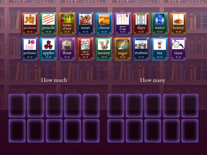 How much: flour, water, cheese, perfume, time, money, tea, sugar, meat, honey, How many: students, apples, pencils, days, cups of tea/ coffee, bottles of juice, spoons of sugar, jars of honey,